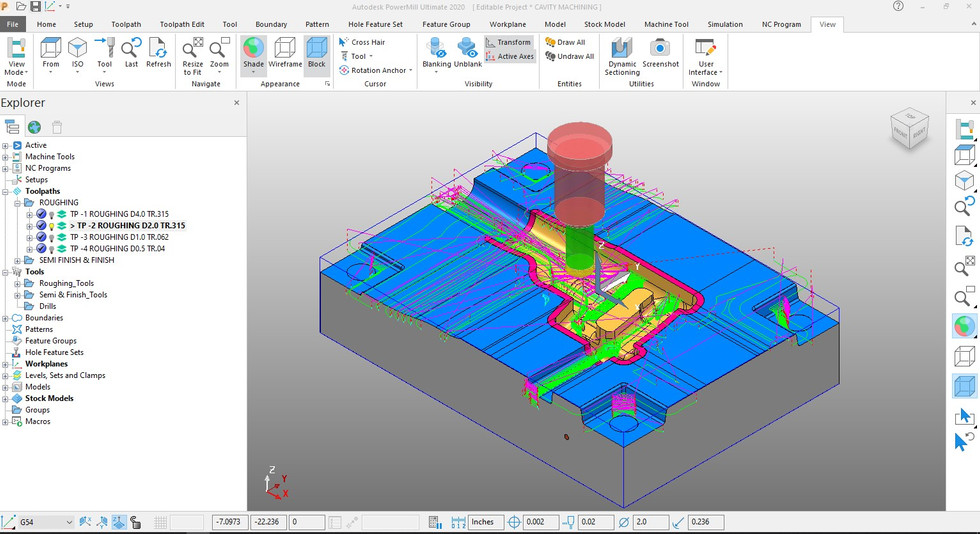 ROUGHING THE CAVITYApr 24, 20211 min readRoughing is carried out with MODEL REST AREA CLEARENCE strategy. Using smaller tool every next roughing toolpath helps to clear the majority of the stock with referencing stock model every time. TP-1-ROUGHING D4.0 TR0.315TP-2-ROUGHING D2.0 TR0.236TP-3-ROUGHING D1.0 TR0.062TP-4-ROUGHING D0.5 TR0.04