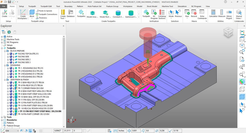 Using various strategies such as constant Z, optimized constant Z, Raster and corner pencil finishing , to finish the main core body part. First two strategies are semi-finishing the part and other are removing the leftover stock and finishing the component.